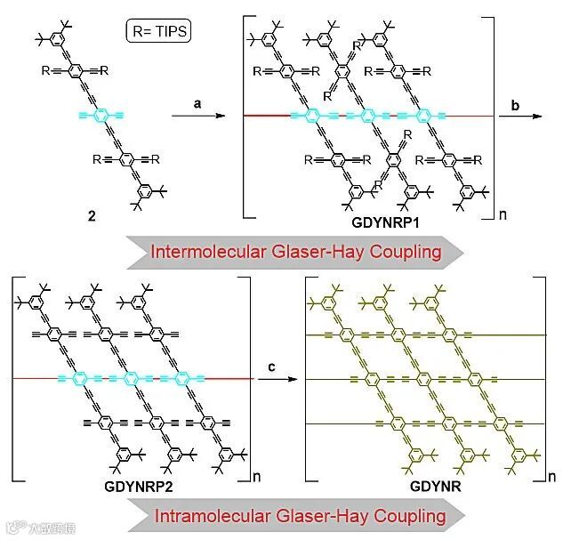图2. 逐步分子间和分子内Glazer-Hay 偶联反应合成石墨炔纳米带。