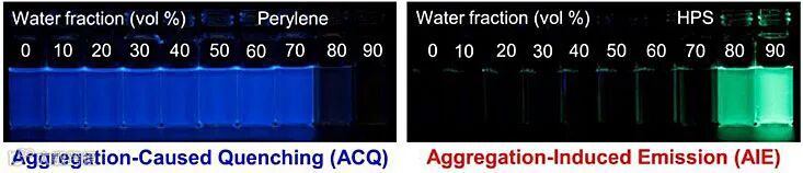传统的ACQ现象与“反常”的AIE现象:(左)苝(perylene)分子聚集后发光完全猝灭(ACQ);(右)六苯基噻咯(HPS)分子聚集后发光大幅增强(AIE)。图片来源:Chem. Rev., 2015, 115, 11718–11940.
