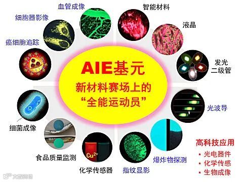 在固态下或作为纳米粒子高效发光的AIE材料在高科技领域的潜在应用。图片来源:唐本忠课题组。