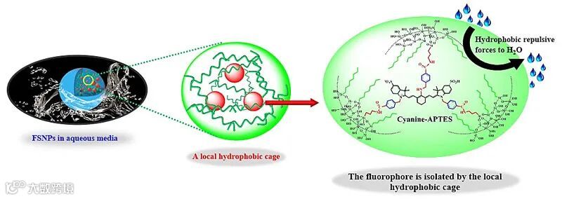 图1. FSNPs内部近红外氨基菁染料的封装方式和“纳米疏水笼”结构