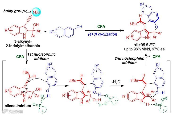在此策略指引之下,石枫课题组设想在3-炔基-2-吲哚甲醇的炔基末端引入叔丁基以增大位阻,在2-吲哚甲醇的苄位引入二芳基以增加反应活性,采用易被B*-H活化的2-萘酚或苯酚作为环状双亲核试剂,设计了手性磷酸(CPA)催化下3-炔基-2-吲哚甲醇与2-萘酚或苯酚的不对称(4+3)环化反应(图3)。通过该反应,实现了新型轴手性芳基烯烃-吲哚骨架的催化不对称构建,获得了良好的收率、优秀的(Z/E)选择性和高的对映选择性(all >95:5 E/Z, up to 98% yield, 97% ee)。