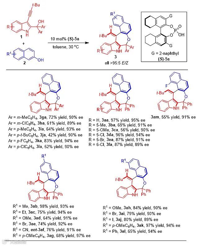 通过对反应底物的适用范围考察,作者发现,无论是在3-炔基-2-吲哚甲醇1的吲哚环及苄位引入各种取代基,还是在萘酚2的不同位置引入吸电子或给电子取代基,该反应都可以顺利进行,以良好的收率、高的立体选择性地得到轴手性芳基烯烃-吲哚衍生物3(图4)。
