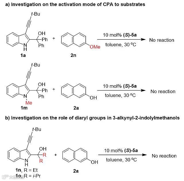 此外,作者通过控制实验对反应中催化剂活化底物的模式、3-炔基-2-吲哚甲醇苄位取代基对反应活性的影响进行了研究。研究结果表明:(1)萘酚的OH基团和2-吲哚甲醇的NH基团对反应能否进行起着至关重要的作用(图6a),作者推测这两个基团在反应中可能与手性磷酸形成了氢键;(2)2-吲哚甲醇苄位的二芳基对底物活性具有重要作用,作者推测这可能是与二芳基能够稳定反应中的碳正离子中间体有关,作者还通过理论计算进一步证实了这一推测(图6b)。