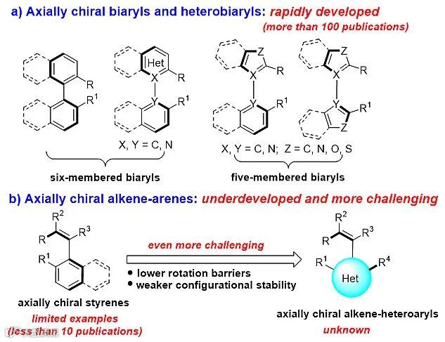 阻旋异构现象是自然界的一种重要基本属性,具有阻旋异构现象的轴手性芳环骨架存在于许多天然产物、生物活性分子、手性配体和催化剂中,该类骨架的催化不对称构建已经引起了化学工作者的强烈兴趣。其中,轴手性联芳环及杂芳环骨架的催化不对称构建发展地十分迅速(图1a)。与之相比,轴手性烯烃-芳环骨架的催化不对称构建发展地非常缓慢,这主要是由于存在旋转能垒较低、构型稳定性较弱、(Z/E)选择性和对映选择性难以控制等挑战性问题。尤为突出的是,轴手性烯烃-杂芳环骨架更是鲜有报道,该类骨架的催化不对称构建属于一个未知的化学领域,更加具有挑战性,这是由于该类骨架中同时存在轴手性烯烃和轴手性五元杂芳环这两种结构单元,导致旋转能垒更低、构型稳定性更弱。所以,设计新型的轴手性烯烃-杂芳环骨架、开发独特的策略以实现该类骨架的催化不对称构建,已经成为一个迫切需要解决的科学问题(图1b)。