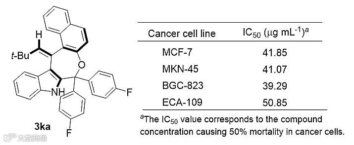 最后,作者对部分轴手性芳基烯烃-吲哚化合物进行了肿瘤细胞的细胞毒活性筛选,发现化合物3ka对多种肿瘤细胞都具有较好的抑制作用(图10)。