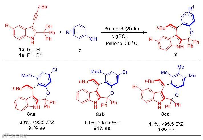 作者还尝试使用取代苯酚7作为双亲核试剂,与3-炔基-2-吲哚甲醇1进行催化不对称(4+3)环化反应(图5)。结果表明该反应具有较好的底物兼容性,双取代以及三取代苯酚均能够适用于此反应,高立体选择性地得到相应的轴手性烯烃-吲哚衍生物8。