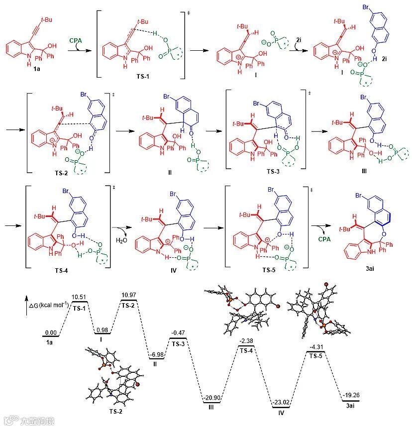 作者与湖南科技大学的焦银春课题组合作,对这两条反应路径进行了理论计算,计算结果表明第一条反应途径更加合理。结合理论计算,作者推测了反应的过渡态及催化剂活化反应物的活化模式(图7):3-炔基-2-吲哚甲醇与手性磷酸结合后,经过渡态TS-1转化成联烯亚胺正离子中间体I,手性磷酸分别通过离子对及氢键作用活化中间体I及萘酚,促使二者发生亲核加成反应,形成轴手性中间体II,然后恢复芳构化得到轴手性中间体III,手性磷酸活化中间体III,使其脱水形成中间体IV,中间体IV发生分子内亲核加成反应,最终得到轴手性芳基烯烃-吲哚衍生物。值得注意的是,作者通过理论计算,发现3-炔基-2-吲哚甲醇可以在手性磷酸催化下转变为一种新型的手性联烯-亚胺中间体I,这将为深入研究该类新型吲哚甲醇参与的化学反应提供重要的理论依据。