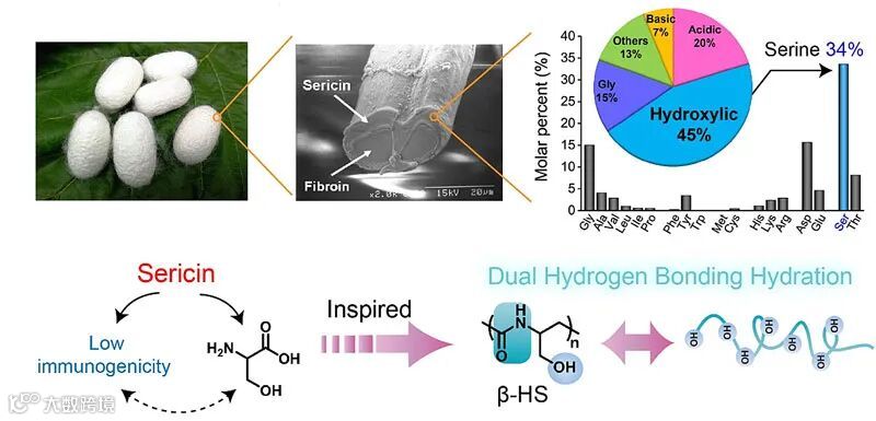 蚕丝是广为人们熟知的天然材料,具有低免疫性优点。那么,是否可以模拟蚕丝的分子结构,设计一种具有低免疫原性的材料,从而应用在生物医学领域呢?近日,华东理工大学的刘润辉教授课题组报道受蚕丝蛋白启发,设计获得了一类新型抗粘附抗植入异物反应高分子材料——聚β-丝氨酸。
