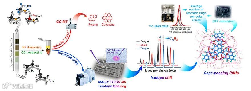 分子筛催化的石油化工(催化裂化、异构化等)和煤化工(甲醇制烯烃、合成气转化等)等工业过程中,多环芳烃积碳物种广泛存在,并不可避免。工业上失活催化剂需要不断烧炭再生,工程设计复杂,很大程度上限制了工业效率。延缓积碳或避免催化剂失活,首先需要明确解析积碳分子结构,揭示完整的积碳演变路径。目前积碳分析常用的溶碳萃取-色质分析方法及原位谱学手段只能鉴定较轻的积碳分子结构,无法解析重的积碳分子结构。而工业甲醇制烯烃反应中大量的积碳为重的稠环芳烃物种。对积碳物种结构进行全面解析对积碳失活和催化剂再生过程具有重要现实意义。
