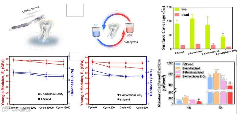 此外,该修复层与牙釉质连接紧密,可以耐受15000次牙刷磨损和600次冷热循环,性能保持稳定,使用寿命长;同时,非晶氧化锆层呈现出亲水性、电负性和光滑等特点,可抵抗致龋细菌的粘附和增殖,保护口腔环境。
