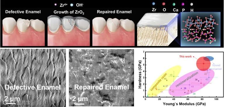 近年来,硬组织修复在生物医学与生命健康领域备受关注。以人类牙釉质为例,极高的硬度保证咀嚼功能的同时保护口腔生理环境。在日常生活中,如致龋细菌、机械损伤或pH值极高的饮料等,都易引起严重的口腔疾病和系统性疾病;并且人的牙釉质是超硬、高度结晶的,无法在整个生命周期中自我修复或再生,故亟需开发可靠和可持续的牙釉质修复技术用以提高生物体的生活质量,延长生物陶瓷材料的寿命。目前牙齿修复策略主要由复合树脂或玻璃离子胶结物组成的复合材料自上而下得填充至缺损牙釉质中,但是它们的聚合收缩会导致材料-牙釉质界面产生微渗漏;此外,自下而上的生物矿化法近年来也被用来修复牙釉质,但其效率低,界面连接薄弱,严重制约了生物矿化法在硬组织修复领域的应用。