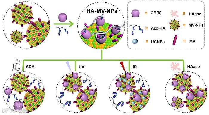 针对这一现象,澳门大学王瑞兵课题组、李铭源课题组和吉林大学杨英威课题组合作构建了基于超分子主客体作用的透明质酸包被纳米粒,其多重刺激响应性可实现透明质酸包被层的脱保护和功能性纳米粒活性的精确控制(decoating induced activation, DIA)。研究人员先通过葫芦[8]脲(CB[8])、偶氮苯修饰的透明质酸(Azo-HA)和甲基紫精修饰的PLA纳米粒(MV-NPs)之间的三元主客体作用,制备透明质酸包被纳米粒(HA-MV-NPs)。甲基紫精,俗称百草枯,被广泛用作除草剂,在药理研究中也可作为经典的ROS诱导剂,因此,MV-NPs可作为很好的功能性纳米粒,但在使用过程中也显示出高毒性。随后研究发现,与MV-NPs相比,HA-MV-NPs则显示出较低的毒性,并且细胞、斑马鱼和小鼠等模式动物的安全性评价实验进一步证明了HA-MV-NPs较高的生物相容性,这主要得益于主客体介导的HA包覆作用。在紫外线(或阳光)作用下,由于偶氮苯的构型反转,高稳定性的HA-MV-NPs因HA包覆层的取出而被激活,表现出良好的除草剂活性。同时,透明质酸酶(HAase)是由金黄色葡萄球菌等菌株特异性分泌的一种内源性物质,可以降解HA-MV-NPs的透明质酸包被层,在体外和体内对金黄色葡萄球菌感染实验中HA-MV-NPs表现选择性的抗菌活性。此外,在将上转换纳米颗粒加入HA-MV-NPs后,由于上转换纳米粒可将穿透能力更强的红外光转化为紫外光,从而引起HA-MV-NPs上偶氮苯的构型翻转,实现HA-MV-NPs在体内的选择性激活,,并显示出一定的抗肿瘤疗效。这些结果表明基于主客体作用所构建的多糖包被功能性纳米粒可通过DIA策略实现对其活性体内体外的精确控制,从而拓宽其在各领域的应用范围。