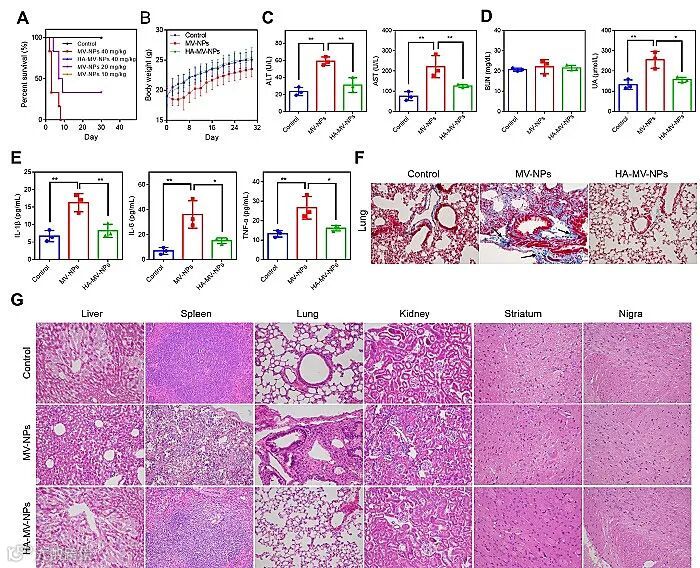 图3. MV-NPs和HA-MV-NPs在小鼠模型中的安全性评价。(A)小鼠存活率曲线。(B)小鼠体重变化曲线。(C)肝功能(ALT和AST) 评价。(D)肾功能 (BUN和UA) 评价。(E)血清炎性细胞因子分析。(F)小鼠的肺组织Masson染色。(G)小鼠肝、脾、肺、肾和大脑(纹状体和黑质)的H&E染色。