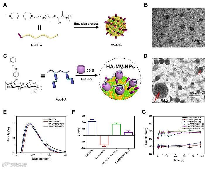 图2. MV-NPs和HA-MV-NPs的制备及表征。(A) MV-NPs的制备。(B) MV-NPs的TEM图像。(C) HA-MV-NPs的制备。(D) HA-MV-NPs的透射电镜图像。(E) 不同条件下MV-NPs、HA-MV-NPs的粒径。(F)不同条件下MV-NPs和HA-MV-NPs的Zeta电位。(G)MV-NPs和HA-MV-NPs的稳定性。