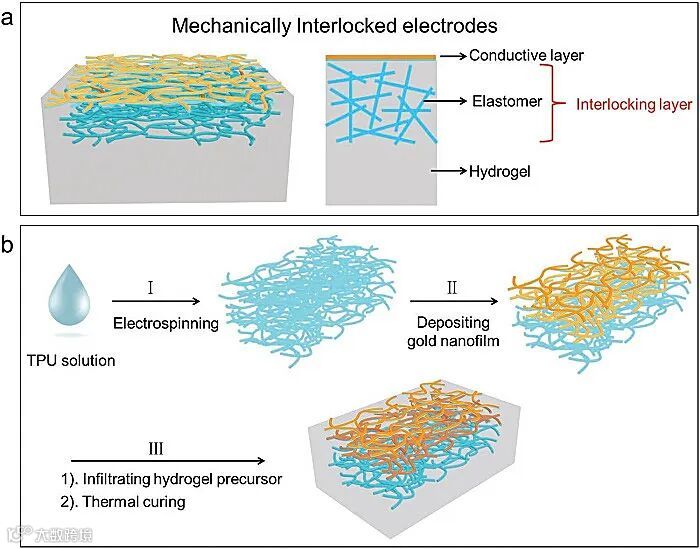为同时保证柔性电子皮肤的高机械柔性和导电性,柔性基底(如水凝胶)和导电层必须保持其本体和薄膜形态不被破坏;其粘附强度的提升只能从界面处着手。研究团队选用聚合物弹性体热塑性聚氨酯(TPU)为界面层材料;通过静电纺丝技术制备TPU多孔网格结构,在表层沉积Au纳米膜构筑导电层,然后浸润水凝胶预聚体、热固化得到具有机械互锁结构的水凝胶-TPU杂化材料,并可以用于制备柔性电子皮肤。