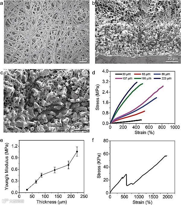 SEM测试显示,静电纺丝制备的TPU具有相互缠结的多孔结构,孔径1-3 µm;水凝胶体系与TPU具有良好的贯穿结构。多孔TPU展现出膜厚依赖性的优异机械性能:当TPU膜厚为137 µm时,最大断裂应变达840%;多孔TPU膜厚为31 µm时杨氏模量为75 KPa(本体无孔TPU模量:2.55 MPa),且随膜厚的增加而增加。研究团队选用聚丙烯酰胺/海藻酸钙 (PAM/Ca-Alg) 为水凝胶体系,该水凝胶体系模量~5.3 KPa、拉伸形变可达初始长度25倍、导电率1.1 mS cm-1;杂化后TPU-水凝胶模量约11.5 KPa(TPU、水凝胶膜厚为0.05和2 mm)。