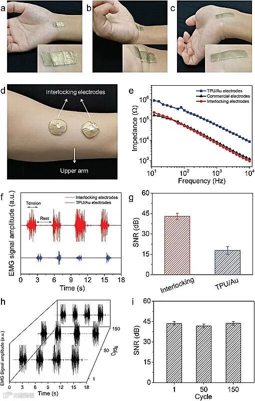 界面粘附强度表明TPU-水凝胶杂化体系界面强度达50.9 J m-2,相比传统的物理堆叠TPU/水凝胶层间粘附强度提升~14.3倍;同时,系统研究表明中间TPU层厚度~85 µm时,体系界面粘附强度最佳。TPU表面蒸镀50 nm厚Au膜厚,体系表面电阻为40.9 ± 6.3 Ω sq-1;在小应变(10%)情况下,具有温和的电阻变化,适用于电生理信号检测。体系在>25%应变时,导电性能衰减明显;体系最大可拉伸率可通过预拉伸的方法予以提升。TPU-水凝胶电子皮肤体系相较于传统的TPU/Au电极等器件具有更优的皮肤共形性,在肌电图、心电图等生理信号检测方面更为精准。