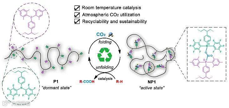 近年来,单链聚合物纳米粒子(single-chain polymer nanoparticle, SCNP)作为一类具有链内可控折叠行为的大分子材料,在纳米催化领域取得了快速发展。在前期研究的基础上,复旦大学闫强课题组开发了一种具有CO2气体折叠功能的单链聚合物粒子,并将其作为羧化酶的模拟物,实现了在室温下、较低分压下对CO2气体的直接催化转化。该单链粒子在催化反应结束后能够自动解折叠、回复链松弛的催化休眠态,而在补充CO2后可再次折叠进入催化活性态,实现可循环的催化功能;并表现出对不同C-H底物(sp3/sp2/sp)的CO2插入活性。
