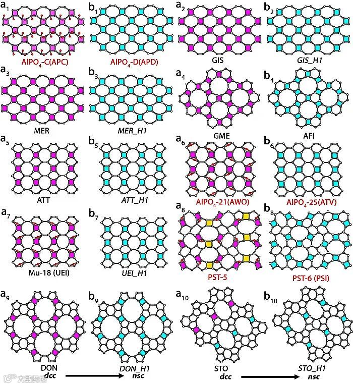 受到PST-5/PST-6间三维-三维拓扑转变的启发,该团队发现包括PST-5/PST-6,已有的分子筛中有12种包含了dcc结构单元。这12种分子筛具结构具有三个不同层度的复杂性。有趣的是,每个层度都包含了一种分子筛观察到了三维-三维拓扑转变。这充分说明了三维-三维拓扑转变普遍适用于磷铝分子筛。该团队对其他还未观测到的拓扑进行了预测,得到了一系列新型结构。