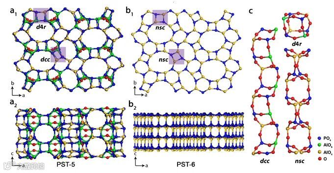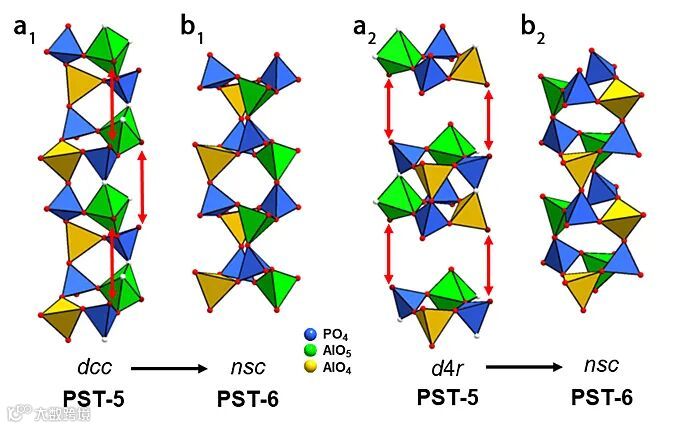PST-5和PST-6这两个结构中包含了相同的层状单元(c轴方向),都是由四元环、六元环、八元环和十元环组成。PST-5中存在五配位的铝原子,通过羟基相互连接。可以发现,PST-5中的double-crankshaft chains (dcc) 和double 4-rings (d4r) 转变为了narsarsukite-type chains (nsc),并且孔道结构也响应的发生了转变。