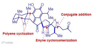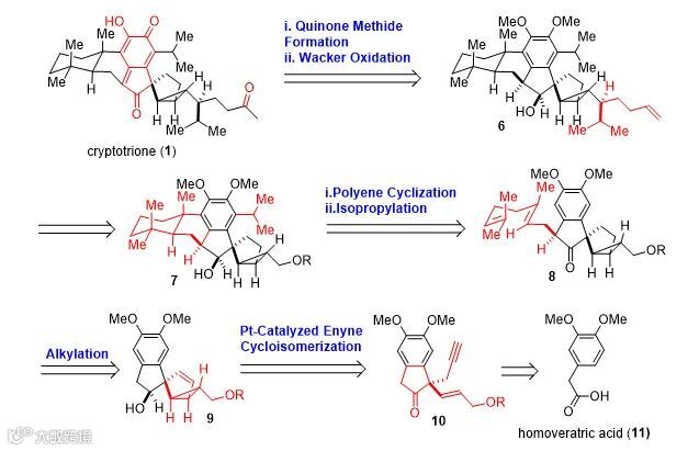 最近,香港中文大学(香港、深圳)的黄乃正院士、彭小水教授研究团队完成了cryptotrione的首次全合成。其合成策略大致如下,从商品化的原料高藜芦酸(11)出发合成苯并五元环中间体,通过烯炔环化异构化反应构筑双环[3.1.0]己烷结构,再通过多烯环化反应构筑松香烷二萜骨架,然后通过共轭加成反应构筑侧链,最后转化形成亚甲基苯醌结构,完成cryptotrione的全合成。