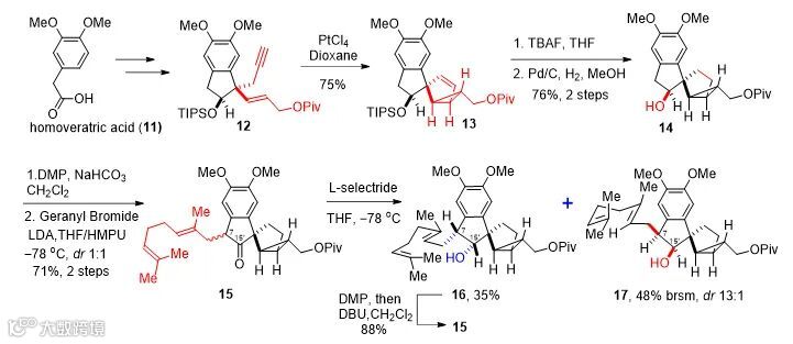 该全合成工作的路线是以商品化的高藜芦酸 (11) 为起始原料,经过几步转化后得到烯炔环化前体12。接着作者尝试通过金/铂催化的环化异构化构筑双环[3.1.0]己烷结构。在此之前,该课题组报道了这类烯炔底物的金催化的分子内串联环化反应(Angew. Chem. Int. Ed., 2018, 57, 11365-11368)。通过一系列条件和底物优化,作者发现中间体12在四氯化铂作催化剂、1,4-二氧六环作溶剂时效果最佳,能以75%的收率得到立体化学正确的环化异构化产物13。化合物13经过TBAF脱TIPS保护基、钯碳加氢后得到醇14。醇14经DMP氧化成酮、再经酮的α位烷基化反应得到15。15经L-Selectride还原后得到产物17与副产物16,副产物16经DMP氧化后可转化回到15再次利用。