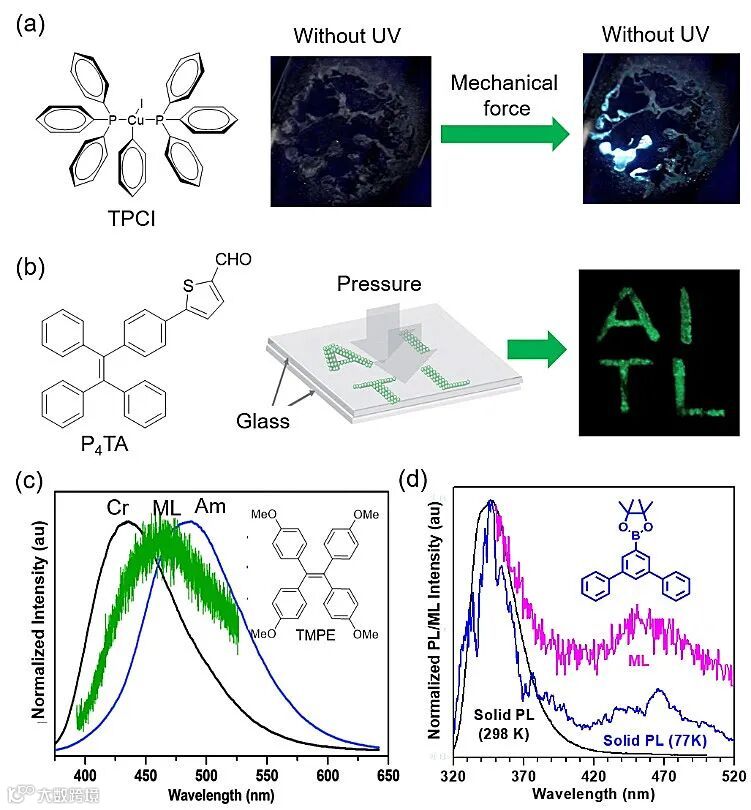 在AIE 20周年即将来临之际,香港科技大学唐本忠院士团队系统总结了AIE及其分支研究领域的最新进展,所列举的AIE的分支方向包括:结晶诱导发光(crystallization-induced emission, CIE);有机室温磷光(room temperature phosphorescence, RTP);聚集诱导的延迟荧光(aggregation-induced delayed fluorescence, AIDF);反卡莎发光(anti-Kasha transition, AKT);簇发光(clusterization-triggered emission, CTE);空间共轭发光(through space interaction, TSI);机械发光(mechanoluminescence, ML);圆偏振发光(circularly polarized luminescence, CPL);聚集诱导产生活性氧物种(aggregation-induced generation of reactive oxygen species, AIG-ROS);光热和光声效应(photothermal/photoacoustic, PT/PA);固态分子运动(solid-state molecular motion, SSMM)。此外,在支持信息里边他们还介绍了一些AIE研究领域新发展起来的研究方向包括:生物基AIE发光体、X-射线激发的AIE发光体以及生物偶联型AIE材料。在所有这些研究方向中,重点介绍了聚集前后分子相关性质的变化以及分子聚集体所赋予分子材料新的功能和特点。其中一些研究方向,例如力致发光(图5)和聚集诱导的非手性向手性的转变,由于其只能在固态下实现,所以传统的分子光物理学或溶液光物理的研究方法根本无法对其进行研究。