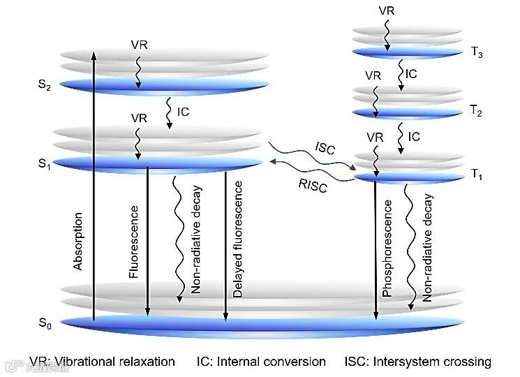 经过3个世纪对发光现象和发光物质持续不断的研究、探索和积累,尤其是从宏观的归纳总结进一步深入到在分子层次上思考,人们最终对发光现象有了相对科学和深层次的理解。发光现象本质上是由吸收了能量的发光分子的高能激发态在去活化的过程中所释放的光子产生的。基于这样一种科学的认知并伴随量子理论的发展,整个发光领域迎来了飞速的发展并取得了巨大的成就,这其中,最为代表性的突破之一便是1933年雅布朗斯基能级图的绘制(图2)。通过雅布朗斯基能级图,人们可以方便直观的看到分子在光照之后所经历的一系列光物理过程包括光子的吸收、振动弛豫、内转换、荧光、系间穿越、磷光以及延迟荧光等。这种在分子层次上对发光现象的阐释对整个发光领域的发展起到了极大的推动作用,直到现在对发光科学领域的研究仍具有非常重要的指导意义。