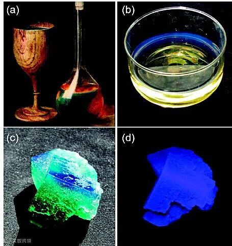 对发光现象的研究遵循同样的研究逻辑。据文献记载,人类对发光现象以及发光物质的研究最早可以追溯到16世纪,西班牙的医生和植物学家Nicolás Monardes记载了从墨西哥树木中浸取出的一种蓝色发光溶液可以用来治疗肾脏和泌尿系统疾病,而其他颜色的发光溶液则不能。这可能是已知文献记载对荧光现象的最早利用(图1a 和1b)。实际上,在早期文献中关于发光物质最为知名的记载是由意大利的鞋匠Vincenzo Cascariolo 在1602年发现的重晶石(Bolognian stone),这种神奇的发光石头引起了包括伽利略在内的大科学家的关注,正如他所评论“我们必须要搞清楚光是如何进入这些石头,然后又如何从石头产生新的光,就像一个新生的婴儿”。其他有名的例子还包括1819年剑桥的Edward D. Clarke等人报道的“杜伦萤石”。杜伦萤石是完全透明的,但在阳光照射下表现出二色性:深蓝色的反射光和翠绿色的透射光(图1c 和 1d)。总的来说,早在19世纪之前,神奇的发光现象已经引起了诸多科学家的注意,包括伽利略、牛顿、波义耳、斯托克斯等人都曾试图去理解并解释发光现象。然而,受当时实验条件以及光物理知识的局限,对发光现象的研究仍停留在现象报道的层面,在机理和本质上面并没有得到很好的理解。