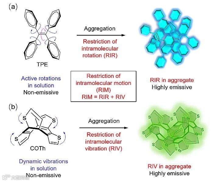 图3. 代表性的AIE化合物以及AIE的机制示意图
