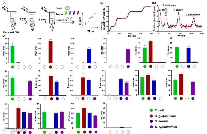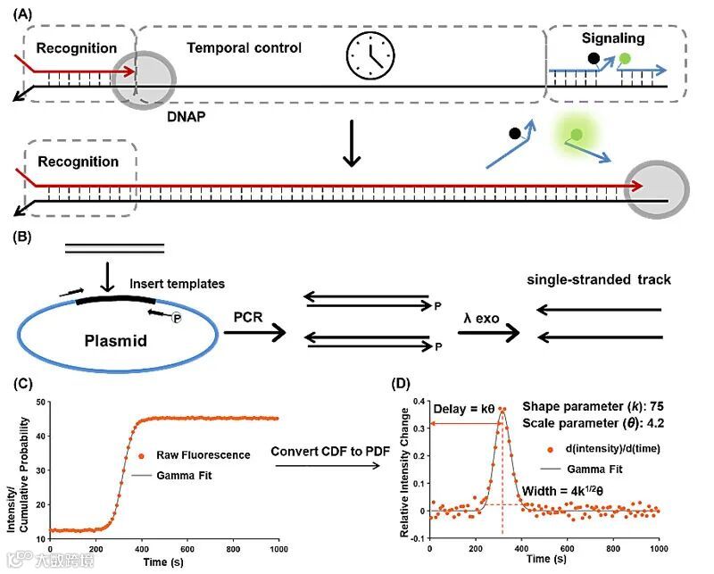 DNA多重检测主要依赖多种颜色的荧光分子标记。但是,按颜色划分的荧光信号类型非常有限,且同时分析多种荧光基团会产生由于光谱之间相互串扰而导致特异性差等问题。受生物体内具有的复杂生物钟模式的启发,北京化工大学苏昕和密西根大学Alexander Johnson-Buck等研究者利用DNA聚合酶(DNAP)合作开发了一种以DNA为模板的探针,以时间标签来实现多重性。这些探针利用等温DNAP介导的延伸信号的延迟时间来区分作为聚合引物的相应靶标,利用DNAP对核苷酸的持续装载能力及其动力学的可控性,作者发现可以使用单一荧光基团在均质溶液中实现多重细菌DNA检测。