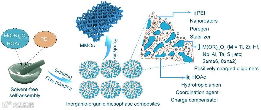 图1. 无溶剂自组装法合成介孔金属氧化物的示意图。