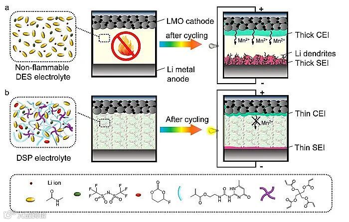 A:本项研究的最大挑战是如何设计可同时解决DES电解质对正负极的电化学兼容性和稳定性,尤其关于高温下过渡金属锂离子在循环过程中析出行为。因此我们开发了具备自愈合特性的准固态聚合物电解质,可有效解决同时解决以上存在的问题。