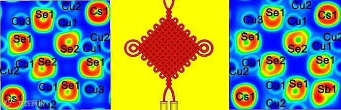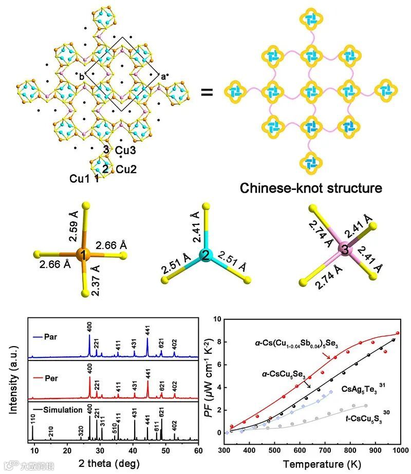 北京师范大学吴立明老师2004年发明了独特且安全的固相合成方法-硼硫化法(J. Am. Chem. Soc., 2004, 126, 4676-4681)。近期,他们利用该方法,发现了一种新的四方相α-CsCu5Se3,并实现宏量合成。该材料拥有前所未见的独特晶体结构:Cs+由类中国结形状的Cu8Se8结构单元构筑的三维无限扩展结构,其中镶嵌Cs+金属阳离子。α-CsCu5Se3热稳定性好,表现出典型晶态固体的热传输行为,并遵循Umklapp散射机制,这与具有类液态的热传导行为的二元化合物Cu2-xSe完全不同。晶体学及热传输性能研究表明α-CsCu5Se3指出了一个有效抑制Cu+液体传输行为特征的方法。与吴立明老师2016年发现的高性能热电材料CsAg5Te3(Angew. Chem. Int. Ed., 2016, 55, 11431–11436)相比,α-CsCu5Se3的晶体单胞体积减小了30%,导致材料具有更强的原子间d轨道重叠作用,从而显著降低有效质量(m*),这使得α-CsCu5Se3相比于CsAg5Te3实现了功率因子200%的增长,达到8.17 μW/cm/K2,是目前报道的碱金属富铜硫属化合物中的最高值;同时,理论研究表明,由于结构中的Cu–Se软化学键和Cs+ 离子扰动作用,该材料具有很低的热导率。综合上述各方面因素,该化合物的本征热电优值ZT达到1.03(980 K)。进一步通过Sb掺杂优化热电性能的研究发现:Sb3+的孤对电子能够增大材料的晶格非谐性,有效增强Umklapp型散射,从而降低声子速度,使得α-Cs(Cu0.96Sb0.04)5Se3的晶格热导率进一步降低至0.40 W/m/K,热电优值ZTmax提升到1.30。该工作系统深入研究了α-CsCu5Se3体系结构和热电相关性能的关系,为低成本、高丰度、高性能硫属化合物材料的设计探索研究迈出重要的一步。