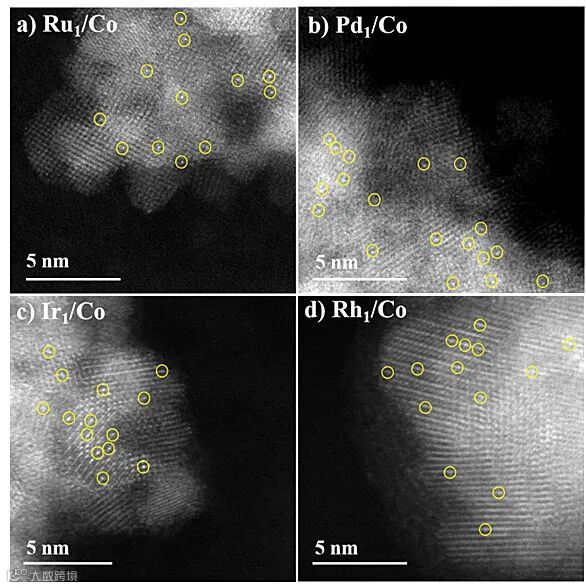 图3. Ru1/Co (a)、Pd1/Co (b)、Ir1/Co (c)、Rh1/Co (d) 单原子合金催化剂的表征