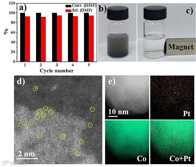 此外,由于金属钴具有磁性,作者可用磁铁快速从反应后的溶液中分离出Pt1/Co。如图6所示,连续循环5次后,HMF的转化率和DMF的选择性基本保持不变(分别为100%和~92.9%),说明该反应中Pt1/Co催化剂的稳定性较好。