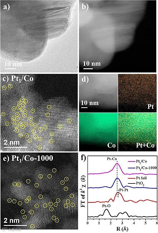以Pt1/Co铂单原子合金催化剂为例,如图1所示。作者首先通过球磨混合一定比例的乙酰丙酮铂和乙酰丙酮钴(1:500),然后通过高温焙烧,在氢气氛围下还原即可得到Pt1/Co铂单原子合金催化剂。作者用球差电镜、同步辐射技术等表明Pt以原子级分散的形式分布在Co上(图2)。