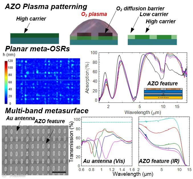 该研究发现,氧等离子体可以大幅度降低氧化锌以及掺铝氧化锌中的载流子浓度,实现高达5个数量级的改变。结合光刻并引入保护结构,该团队提出了一种全新的基于氧等离子体的金属氧化物区域化技术,以实现在不改变材料表面平整度的情况下进行材料的光学特性区域控制。基于该技术,该团队制造了两种全新的光学超材料器件,应用于卫星辐射制冷功能的光学太阳能反射器(Optical Solar Reflector, OSR)以及具有不同工作频段的复合光学超结构器件。