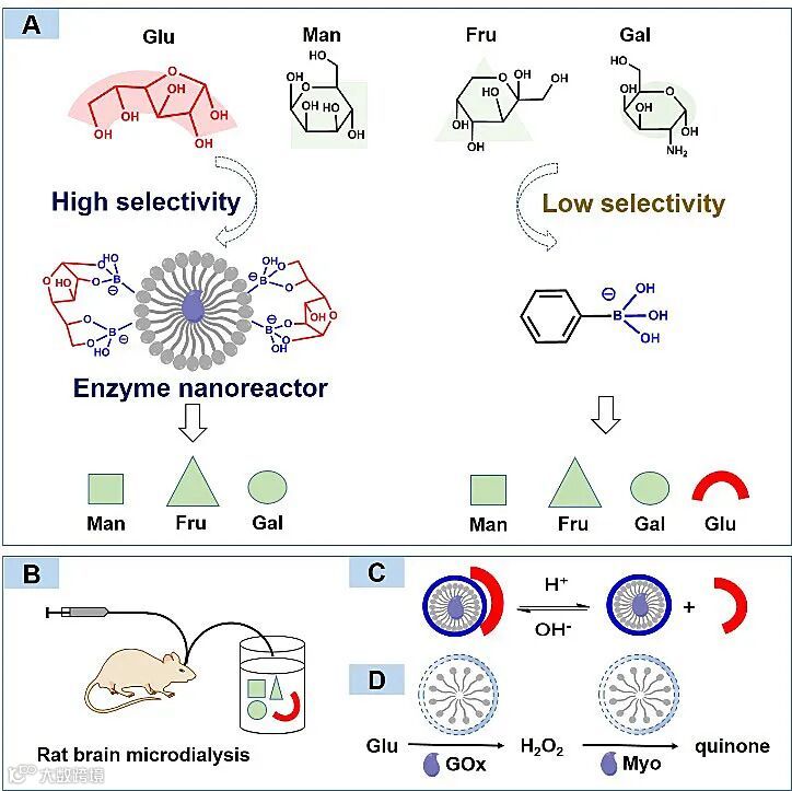 葡萄糖作为人体能量来源及重要的生理活性物质之一,在许多重要的生理和病理过程中发挥着关键的作用。因此,精准地检测并基于涉及大脑功能和神经传导的葡萄糖传感器来分析研究葡萄糖在生物体内的含量及其动态变化是认识众多疾病诊疗相关机制的关键。目前的研究工作普遍认为:构建葡萄糖传感器的难点是如何排除半乳糖、甘露糖和果糖等类似物的干扰。葡萄糖传感器的检测方法主要基于如下两种策略:一种是基于葡萄糖氧化酶的酶促反应方法;另一种是基于非酶反应的选择性检测方法,即利用双羟基 (如:1,2-二醇和1,3-二醇) 与苯基硼酸的快速可逆结合来设计葡萄糖传感器。不过,这些方法均依赖于在复杂样品中加入探针来检测葡萄糖的策略,不可避免地会出现其它糖类的干扰。