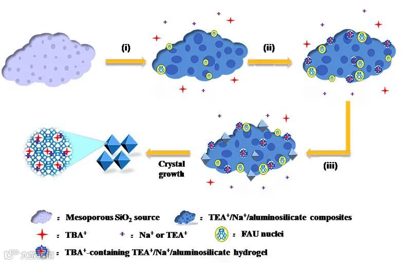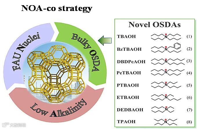 最近中国科学院大连化学物理研究所田鹏研究员、刘中民院士团队提出了高硅Y分子筛的合成新策略(NOA-co策略),在高分散的FAU晶核溶液、较大体积的有机模板剂、低碱度的合成凝胶三者协同作用下合成了硅铝比高达15.6的高硅Y型沸石。基于NOA-co策略,团队发现多种高效合成高硅Y的有机模板剂。相关论文发表于Advanced Materials,第一作者为朱大丽、王林英。