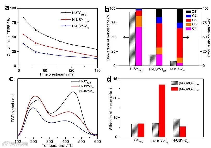 NOA-co策略合成的高硅Y沸石的粒径尺寸为100-250 nm,具有丰富的外比表面积、优异的热/水热稳定性。与后处理法所得的高硅Y沸石相比,NOA-co策略直接合成的高硅Y分子筛具有更多的强酸中心、且酸中心分布相对均一,在大分子原料的裂化反应中表现出优异的催化活性。NOA-co策略的提出为高硅沸石的合成提供了研究新思路。