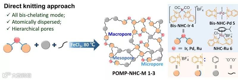针对这一问题,复旦大学化学系涂涛课题组利用傅克反应,通过直接交联(direct knitting)的方式,以三类活性高、稳定性好、结构确定的氮杂环卡宾金属化合物(bis-NHC-Ir,bis-NHC-Pd和NHC-Ru)作为优势均相催化剂前体,制备了一系列多孔有机金属聚合物(POMPs)。通过此方法制得的POMPs材料保持了优势催化剂前体确定的金属双配位模式,金属活性中心具有原子级分散度,可通过调控优势催化剂前体实现负载催化剂的分子级设计和调控。