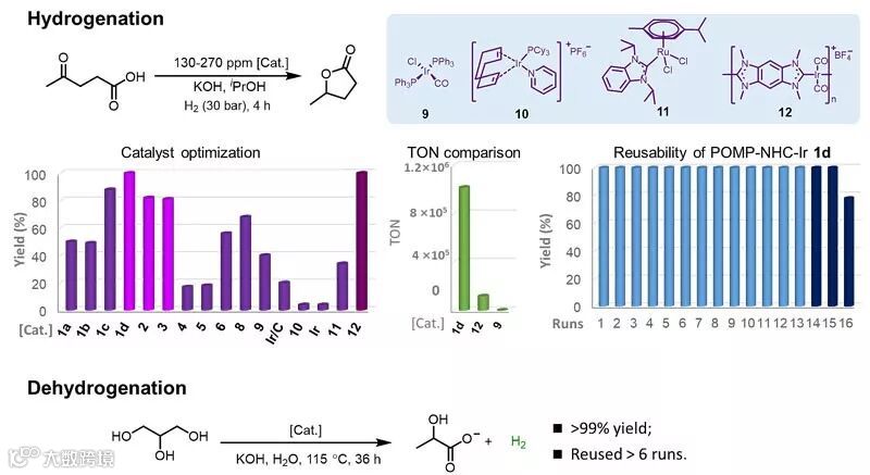 这些优势使其成为优异的可回收固体单分散催化剂,在乙酰丙酸(LA)到γ-戊内酯(GVL)的氢化反应及甘油到乳酸的脱氢反应中均表现出极高的催化活性,尤其是在前者的氢化反应中取得了高达1.01×106的转化数(TON),是相应均相催化剂前体的750倍,且催化剂可以循环使用十余次而没有催化活性的显著下降。