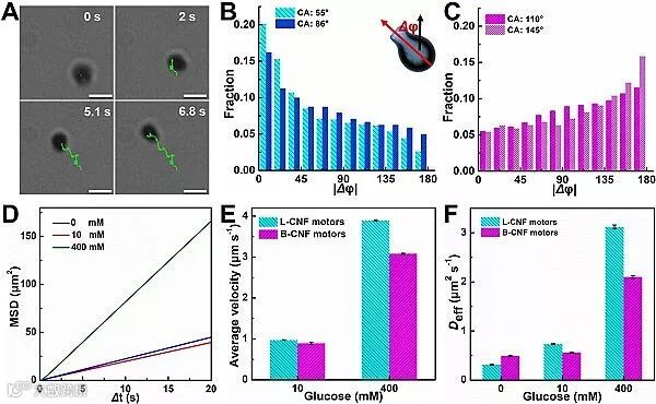 研究团队通过结合水热碳化和真空灌注法,将葡萄糖氧化酶和过氧化氢酶装载到具有相反表面浸润性的花瓶状炭纳米瓶内部制备酶驱动纳米马达。制备得到的两种纳米马达表面浸润性相反(接触角分别为55 ± 4°和110 ± 9°),而形貌、酶装载量、酶活性等其他方面没有显著差异。
