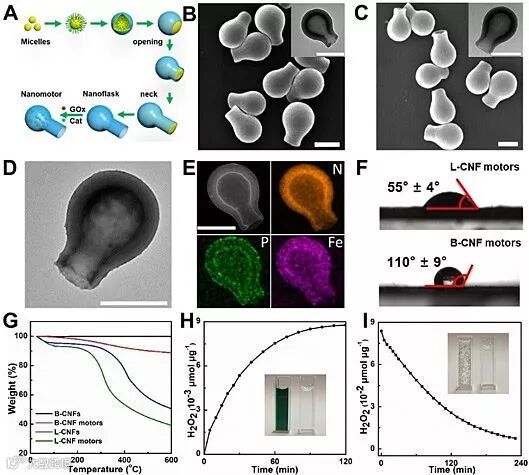 表面浸润性相反的两种酶驱动瓶状纳米马达制备与表征。图片来源:ACS Nano