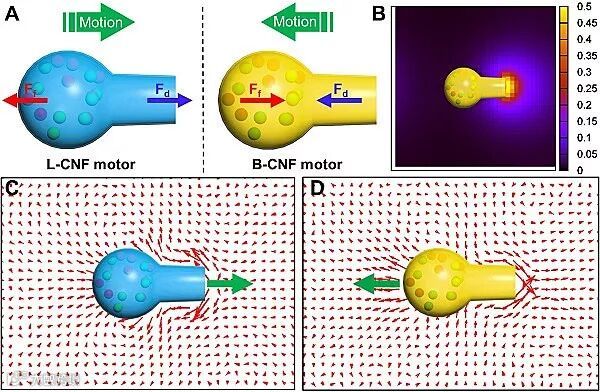 亲疏水酶驱动瓶状纳米马达的受力分析及流体场模拟。图片来源:ACS Nano