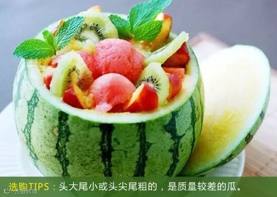 小Tips:西瓜两端匀称,脐部和瓜蒂凹陷较深、四周饱满的是好瓜;头大尾小或头尖尾粗的,是质量较差的瓜。