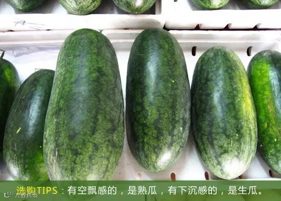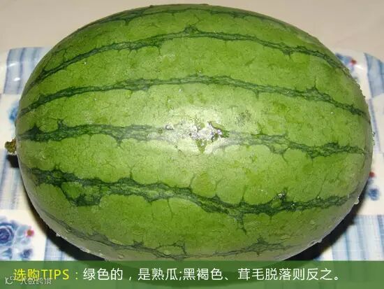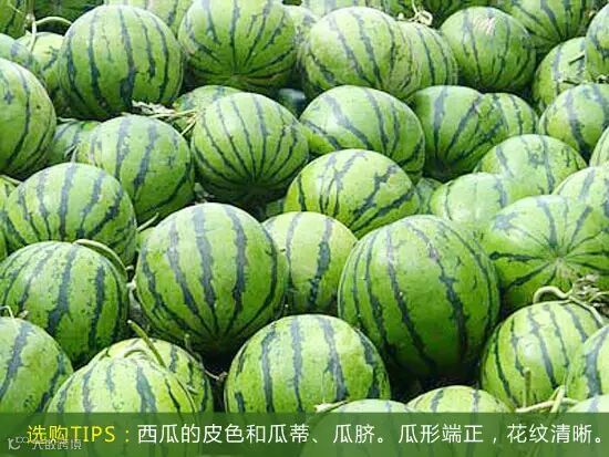 小Tips:先鉴别西瓜的皮色和瓜蒂、瓜脐。瓜形端正,瓜皮坚硬饱满,花纹清晰,表皮稍有凹凸不平的波浪纹,瓜蒂、瓜脐收得紧密,略为缩入,靠地面的瓜皮颜色变黄,就是成熟的标志。瓜皮表面光滑、花纹清晰、纹路明显、底面发黄的,是熟瓜。表面有茸毛、光泽暗淡、花斑和纹路不清的,是不熟的瓜,用手指弹瓜听到“嘭嘭”声的,是熟瓜,听到“当当”声的,还没有熟,听到“噗噗”声的,是过熟的瓜。
