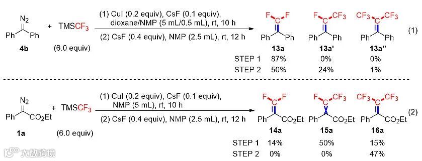 作者分别以二苯基重氮甲烷和苯基重氮乙酸乙酯为底物,对反应进行了初步的尝试(图2)。发现该反应成功的关键在于如何调控重氮底物亲核性和偕二氟烯烃亲电性的平衡,芳基重氮乙酸酯类化合物可以给出更好的反应结果。