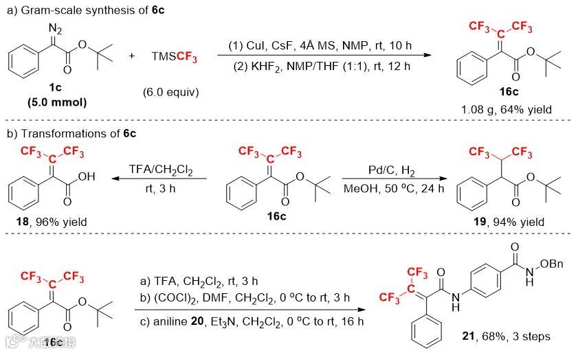 作者还将这一方法放大到克级规模,产率略有降低,但反应仍然能够很好的进行。产物偕双三氟甲基烯烃还可以在三氟乙酸的作用下很方便酸解,生成对应的羧酸衍生物。而且,在钯碳氢化还原的条件下,可以高效的得到六氟异丙基取代的化合物。最后,他们通过三步一锅法以68%的收率合成了HDAC抑制剂的六氟类似物,进一步展示了该方法的实用价值(图5)。
